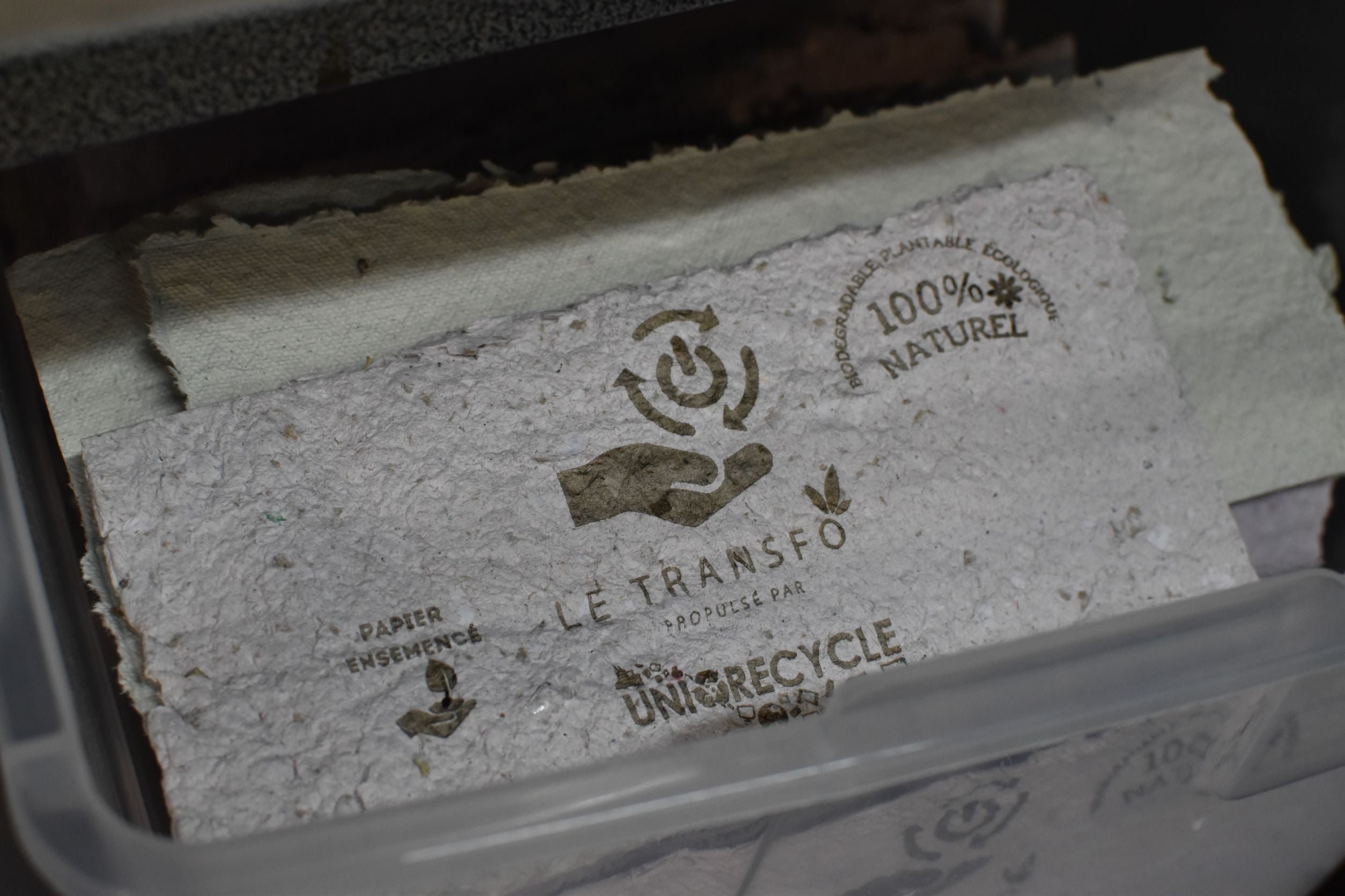 L'emballage est fait avec des emballages résistants recueillis dans les entreprises de la région. L'étiquette est faite avec du papier recyclé et déchiqueté pour ensuite être transformé en papier ensemencé.